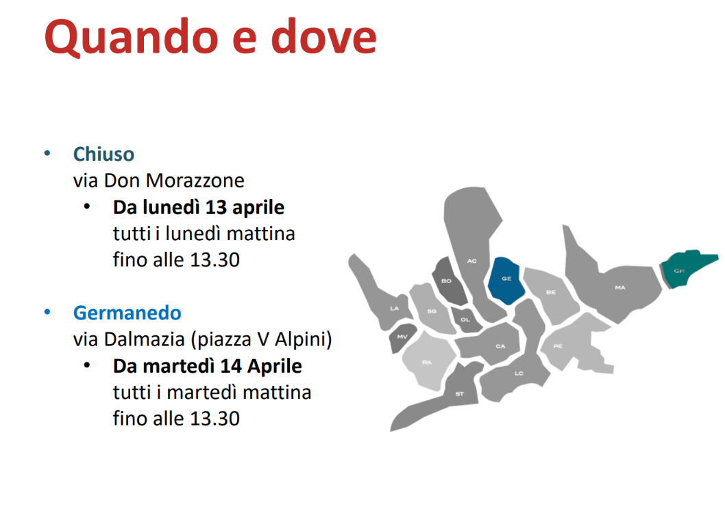 Due i rioni scelti per il progetto: Chiuso, dove il mercato si svolgerà ogni lunedì mattina fino alle 13.30 a partire dal 13 aprile, e Germanedo, tutti i martedì mattina fino alle 13.30 a partire dal 14 aprile.