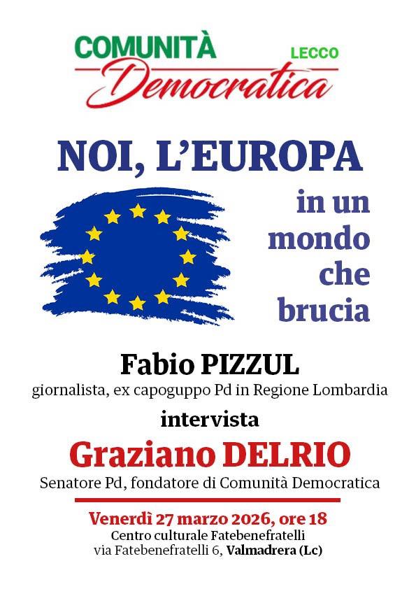 “Noi, l’Europa in un mondo che brucia”: è questo il tema dell’incontro organizzato da Comunità Democratica Lecco, in programma per venerdì 27 marzo 2026 alle 18 presso il centro culturale Fatebenefratelli di Valmadrera.
