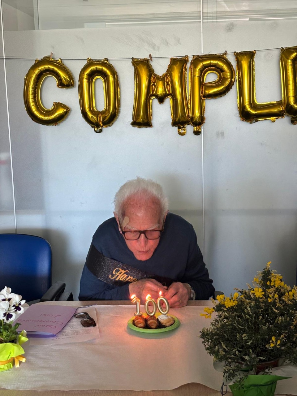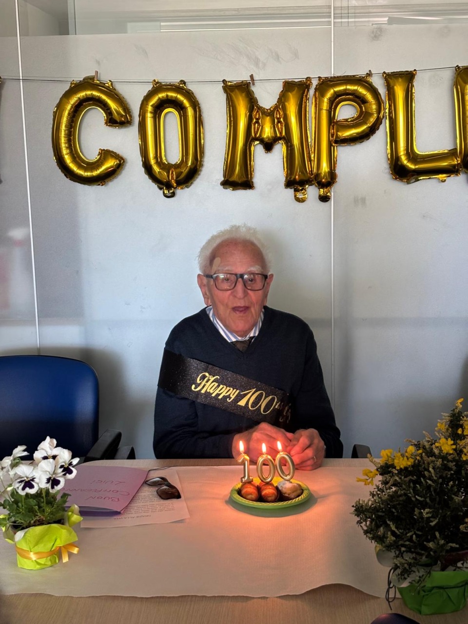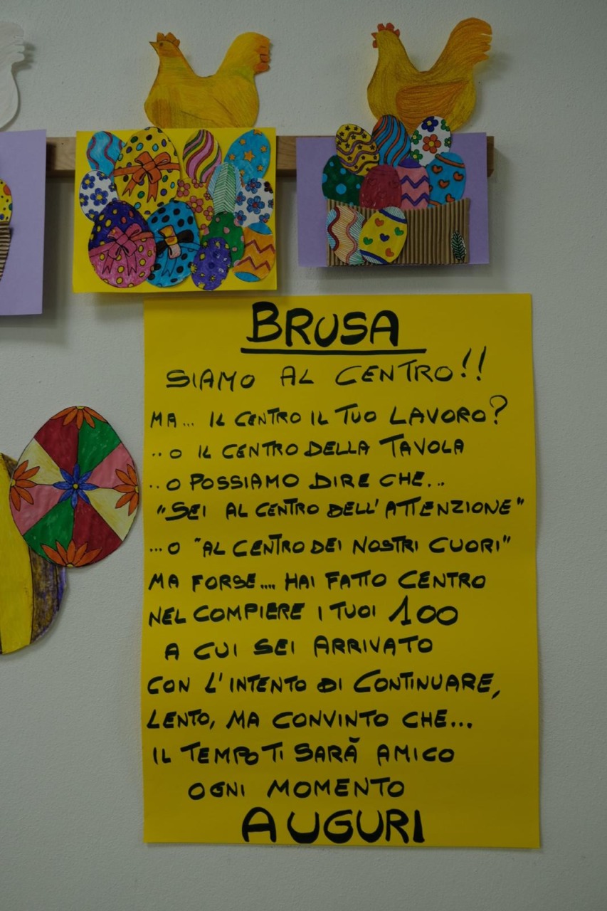 Un momento toccante è stato il video preparato dalle operatrici del centro, che ha incluso brevi interviste agli ospiti, ognuno dei quali ha espresso un personale messaggio di auguri. Le operatrici hanno anche realizzato un biglietto con foto di Luigi, accompagnate da parole sincere che lo hanno profondamente commosso. Emozionanti anche le dediche scritte dai figli su un cartellone allestito nel salone, decorato con fiori, in cui si leggeva: «Brusa, siamo al centro! Ma… il centro del tuo lavoro? … o il centro della tavola? O possiamo dire che “Sei al centro dell’attenzione” o “Al centro dei nostri cuori”. Forse… hai fatto centro nel compiere i tuoi 100, a cui sei arrivato con l’intento di continuare, lento, ma convinto che il tempo ti sarà amico ogni momento». Anche Isa, educatrice del centro, e Fabio Crimella, vice presidente della cooperativa sociale «L’Arcobaleno», si sono uniti agli auguri.