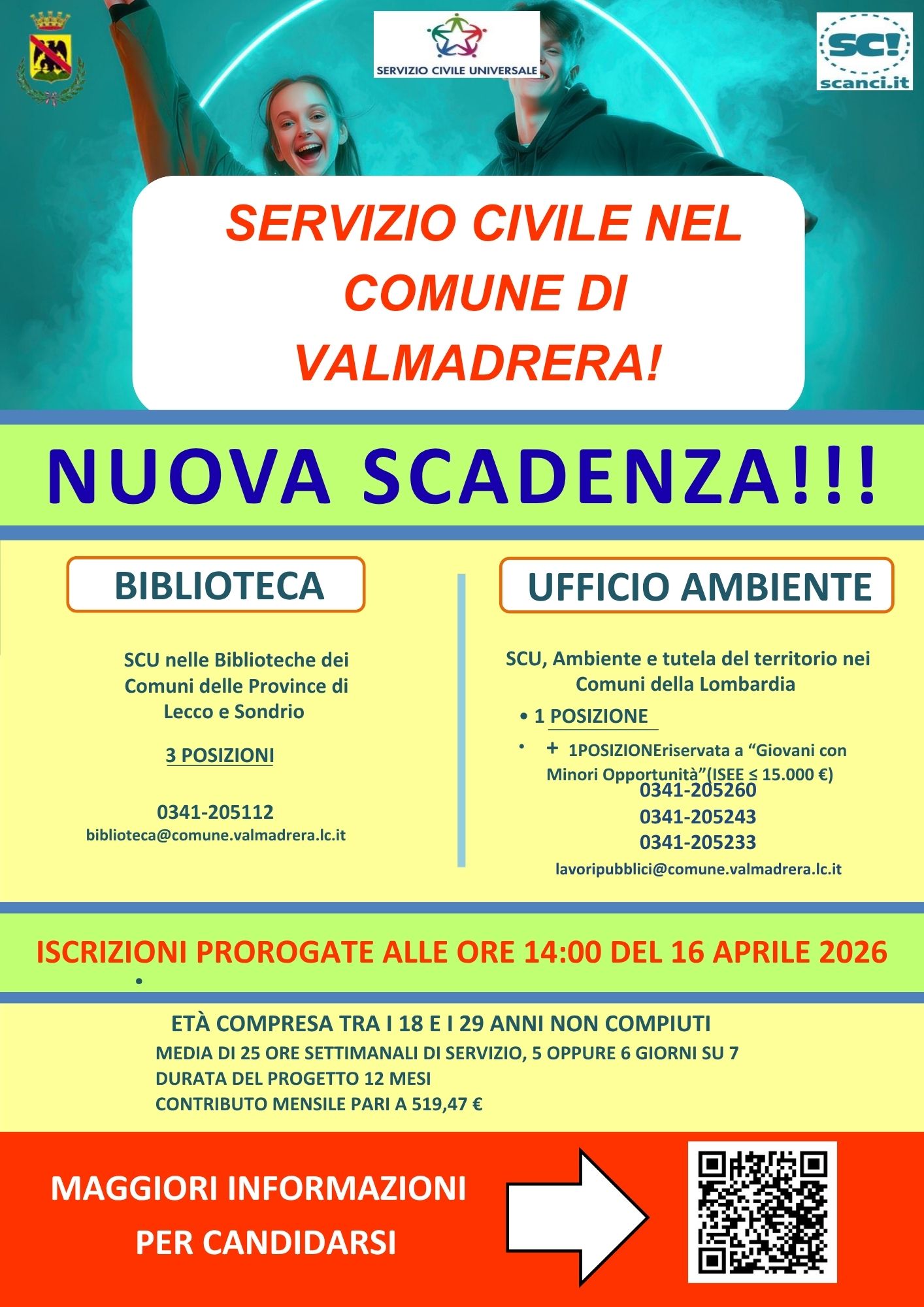 - 3 posti presso la Biblioteca Civica/Ufficio Cultura di Valmadrera, con il progetto “SCU nelle biblioteche delle province di Lecco e Sondrio 2026”.