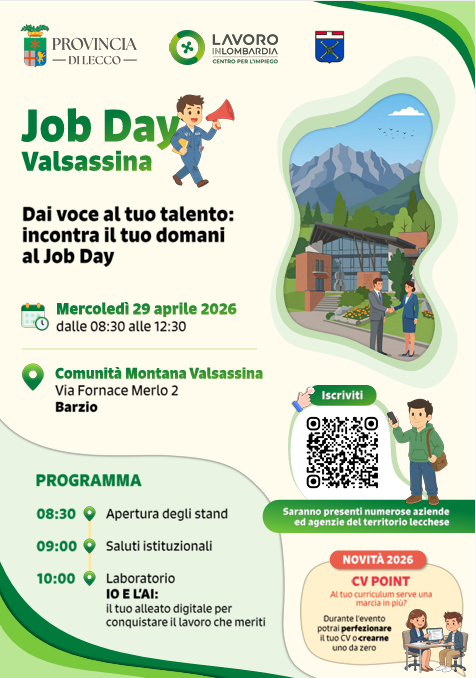 Mercoledì 29 aprile 2026, dalle 8.30 alle 12.30, si svolgerà presso la sede della Comunità Montana Valsassina a Barzio la terza edizione del Job Day Valsassina. Questa iniziativa, promossa dalla Provincia di Lecco, mira a creare un ponte tra le aziende locali e le persone disoccupate o in cerca di nuove opportunità lavorative.