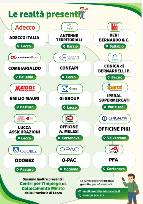 La partecipazione all’evento è gratuita e aperta a tutti. È consigliabile presentarsi con un curriculum vitae per facilitare il matching con le aziende presenti. Sarà attivo un nuovo CV Point, dove esperti dei Centri per l’impiego della Provincia di Lecco forniranno consulenze gratuite per la redazione e il perfezionamento del CV.