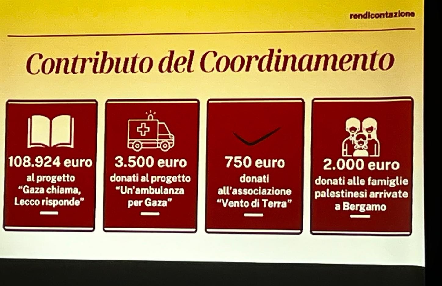 Un aspetto centrale del progetto è il collegamento con Gaza. Attraverso relazioni dirette, il gruppo sostiene una tenda-scuola, che è diventata una scuola in muratura nel campo profughi di Al-Nuseirat, con l’obiettivo di fornire istruzione e strumenti di resistenza civile. Questo impegno ha portato a raccogliere 108.924 euro per il progetto “Gaza chiama Lecco risponde”, oltre a 3.500 euro per un’ambulanza a Gaza, 750 euro all’associazione Vento di Terra e 2.000 euro per le famiglie palestinesi rifugiate a Bergamo.
