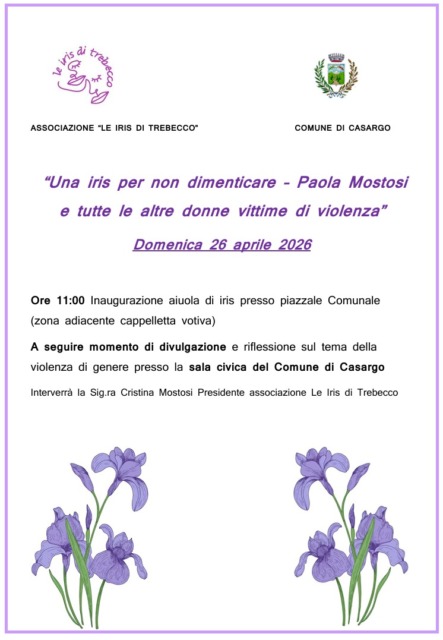 Il Comune di Casargo inaugurerà domenica 26 aprile 2026 alle 11 una nuova aiuola di iris nel piazzale comunale, accanto alla cappelletta votiva. Questo gesto semplice ma significativo sarà accompagnato da un momento di riflessione sul tema della violenza di genere. A seguire, la Sala Civica ospiterà l’intervento di Cristina Mostosi, presidente dell’associazione Le Iris di Trebecco, che da anni si impegna a promuovere iniziative di sensibilizzazione e memoria.