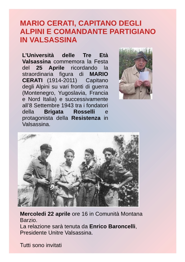 Mercoledì 22 aprile, alle 16, presso la sede della Comunità Montana a Barzio, si svolgerà un evento aperto al pubblico per ricordare Mario Cerati, Capitano degli Alpini e comandante partigiano.