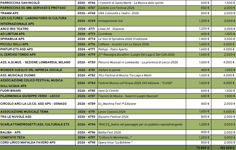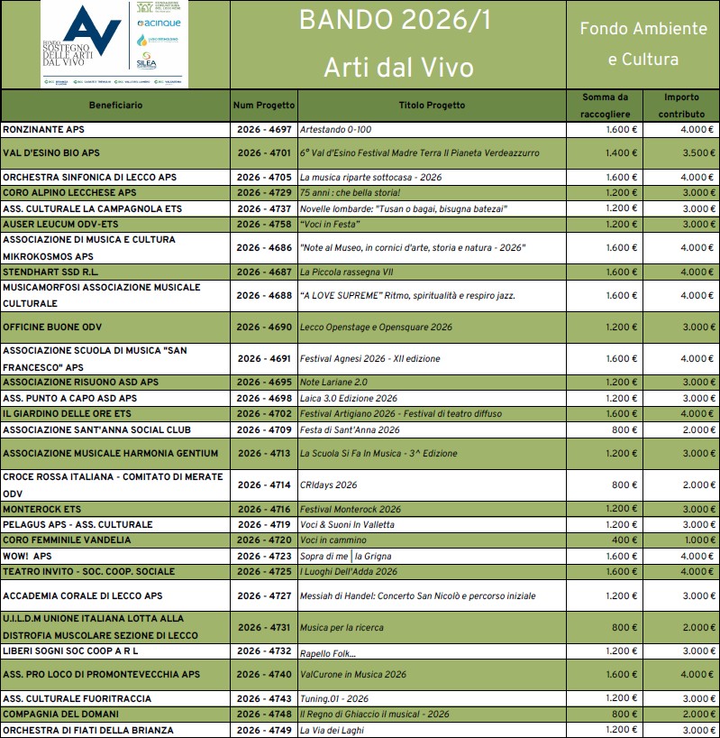 Sono 63 i progetti approvati nell’edizione 2026 del bando “Arti dal Vivo”, a fronte di 67 proposte presentate e un valore complessivo superiore ai 445 mila euro. L’iniziativa è promossa dalla Fondazione Comunitaria del Lecchese in collaborazione con Acinque e i Comuni soci di Lario Reti Holding e Silea, e prevede contributi per un totale di 182 mila euro, grazie anche al supporto delle Banche di Credito Cooperativo del territorio lecchese (Brianza e Laghi, Carate Brianza, Valle del Lambro e Valsassina).