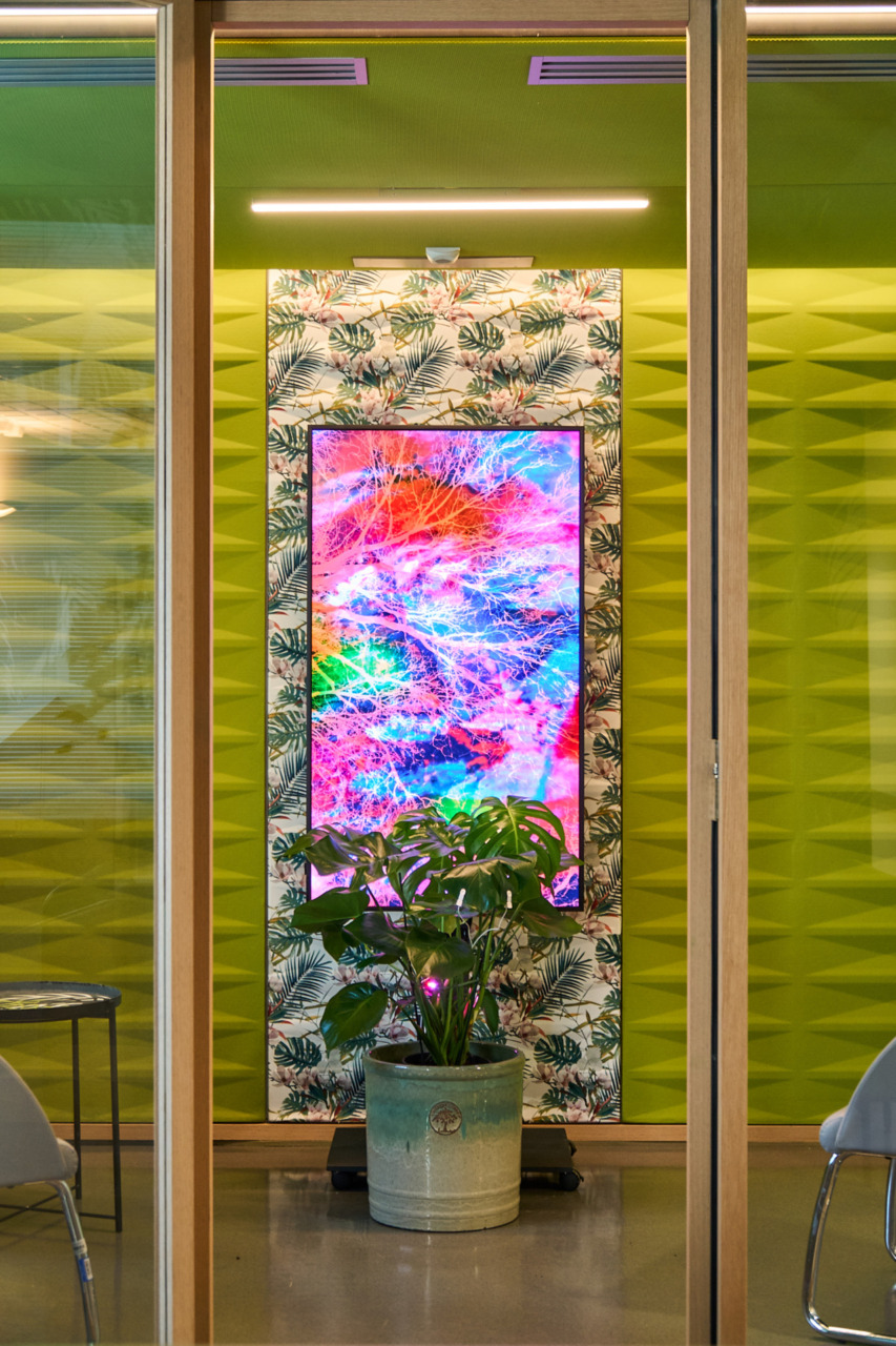 “A/V Herbarum” si presenta come un’entità viva piuttosto che un semplice oggetto. La sua struttura include uno schermo, lampade, sensori e software, con al centro una pianta: la monstera deliciosa, una pianta rampicante sempreverde originaria del Messico, spesso rappresentata nei dipinti di Giuseppe Guerreschi, uno degli artisti preferiti da Villa.
