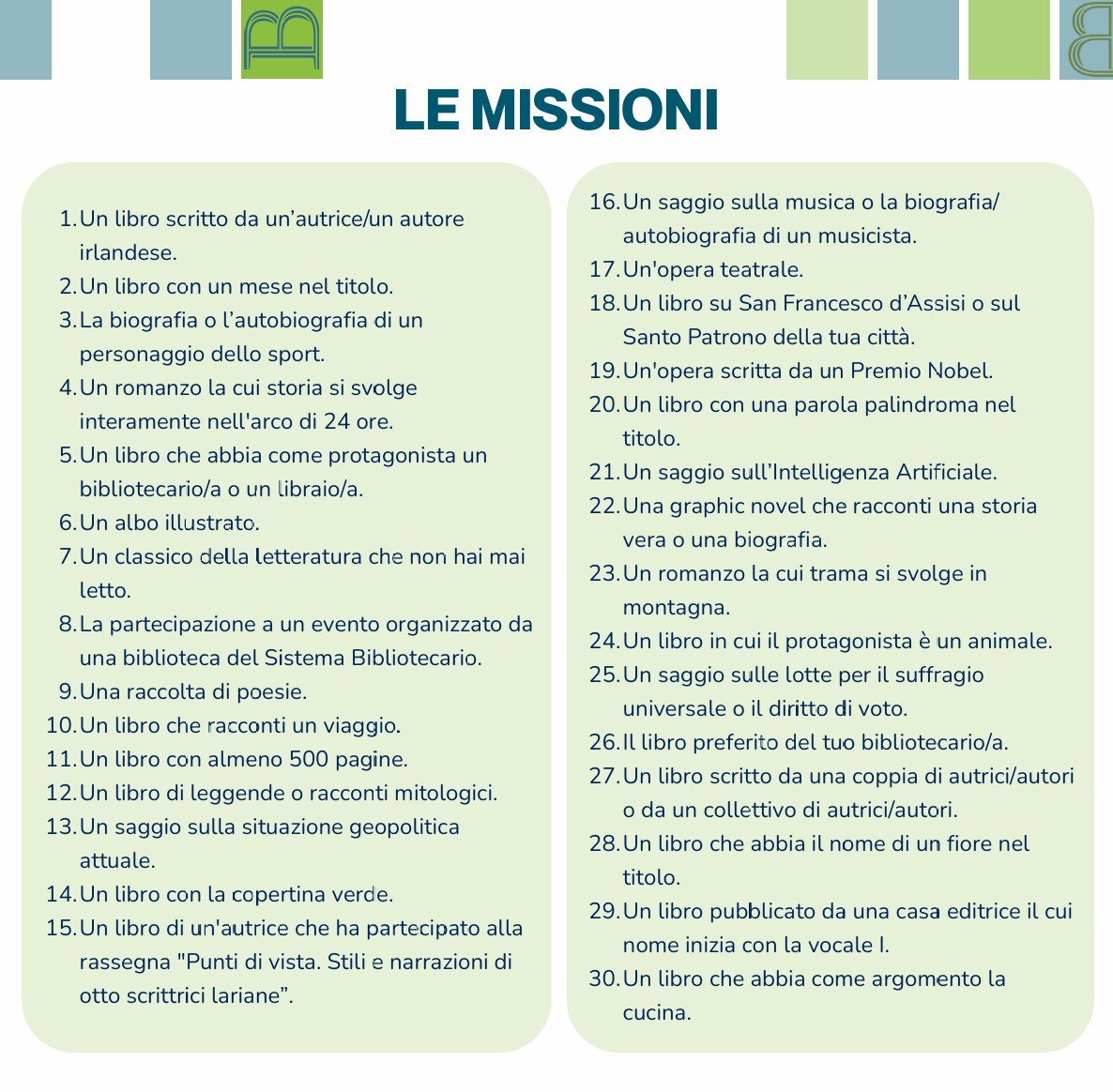 La competizione prevede la lettura di 30 libri, ognuno associato a specifiche “missioni” delineate nel regolamento (nella foto sottostante). Sono previsti un obiettivo intermedio di 15 libri e uno finale, con un totale di 30 libri, tutti presi in prestito da una delle biblioteche del sistema. A ogni partecipante sarà fornito un passaporto di lettura, sul quale i bibliotecari apporranno un timbro per ogni libro letto, creando così un registro personale delle letture svolte durante la sfida.