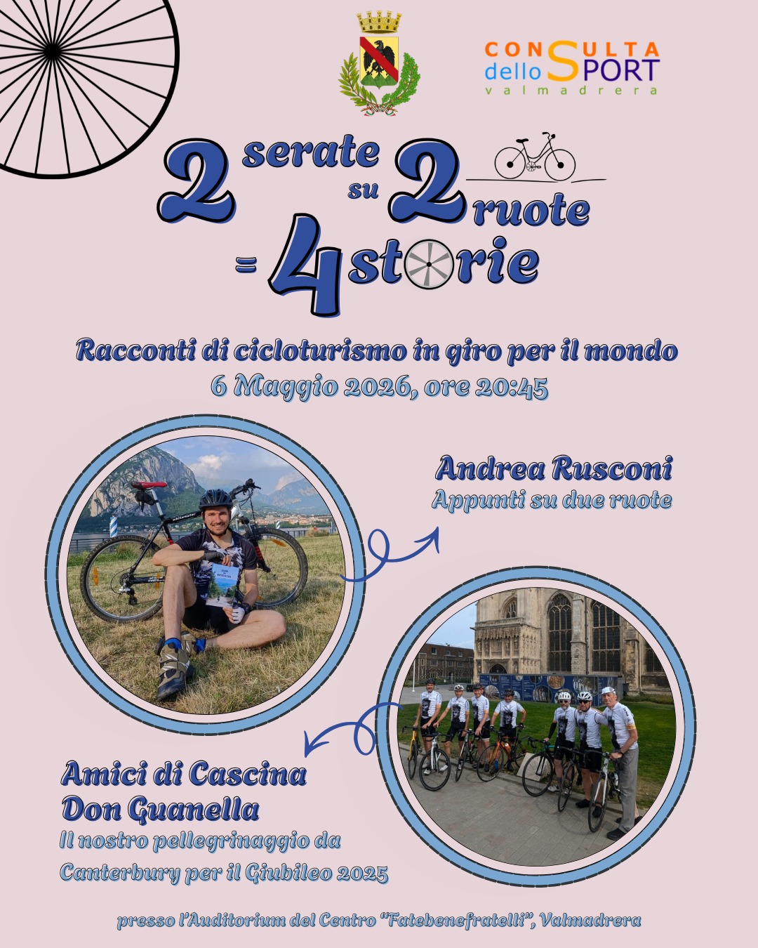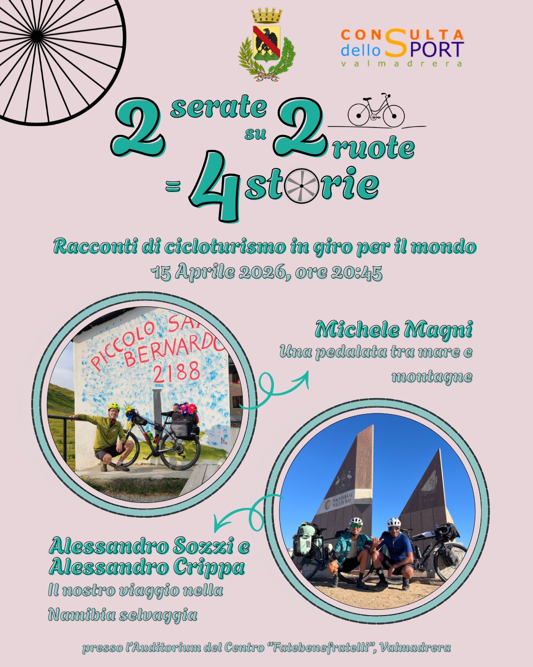 La Consulta dello Sport del Comune di Valmadrera organizza due eventi dal titolo “2 serate su 2 ruote = 4 storie”, incentrati sul cicloturismo. Gli incontri si svolgeranno il 15 aprile e il 6 maggio 2026, alle 20.45, presso l’Auditorium del centro culturale Fatebenefratelli.