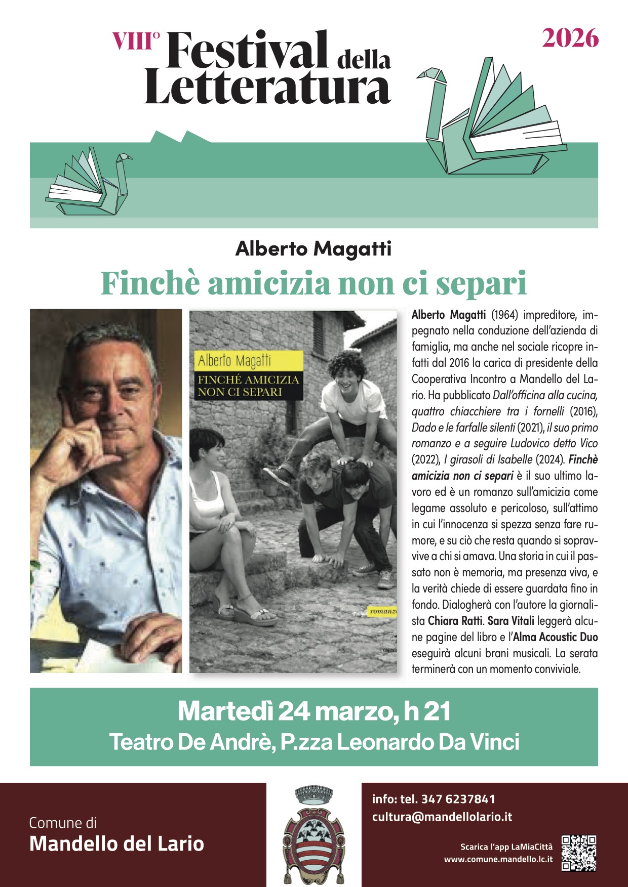 Martedì 24 marzo alle ore 21.00, il Teatro Fabrizio De André ospiterà Alberto Magatti per la presentazione del suo quarto romanzo, Finché amicizia non ci separi, nell’ambito dell’VIII Edizione del Festival della Letteratura.