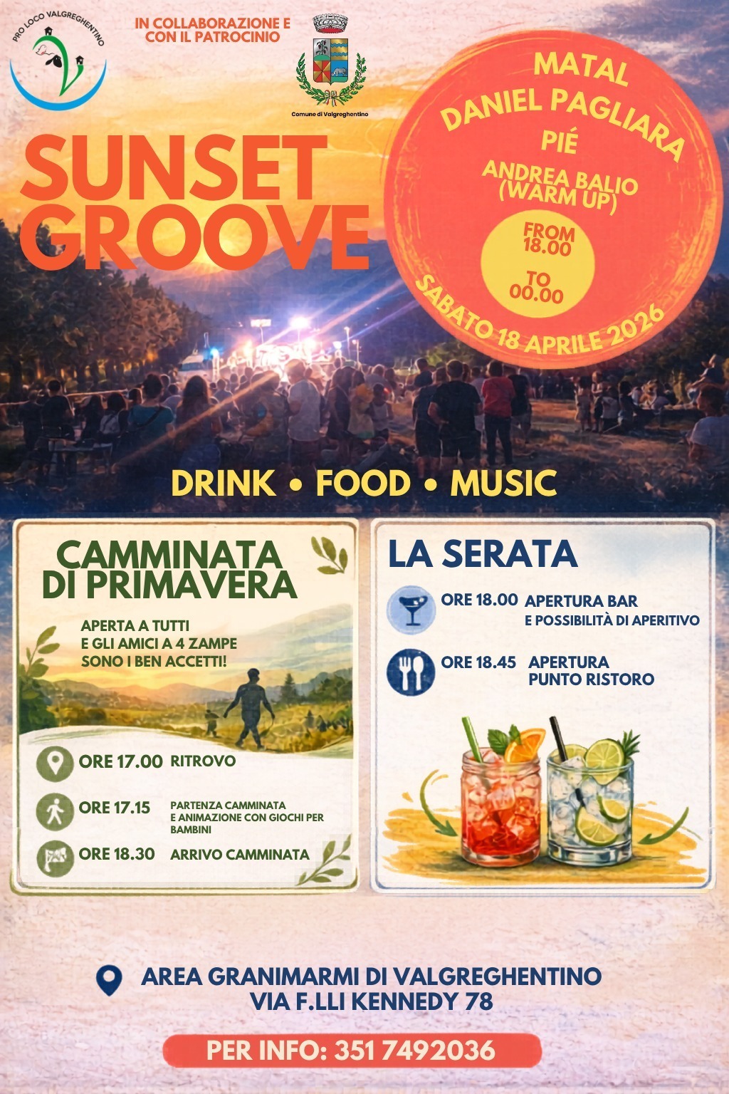 Valgreghentino si appresta a ospitare un sabato straordinario con Sunset Groove 2026, un evento dedicato agli amanti della musica, della natura e della convivialità. Organizzato dalla Pro Loco di Valgreghentino con il patrocinio dell’Amministrazione comunale, l’appuntamento è fissato per sabato 18 aprile 2026 nell’Area Granimarmi, dalle 17 a mezzanotte, promettendo una giornata di relax e divertimento per grandi e piccini.